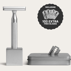 The Rowen Starter Set includes our signature precision razor, a weighted stand to showcase it, a compact blade bank for safe disposal, and a 10-pack of premium blades to get you started right out of the box. Plus, get 100 extra FREE blades.